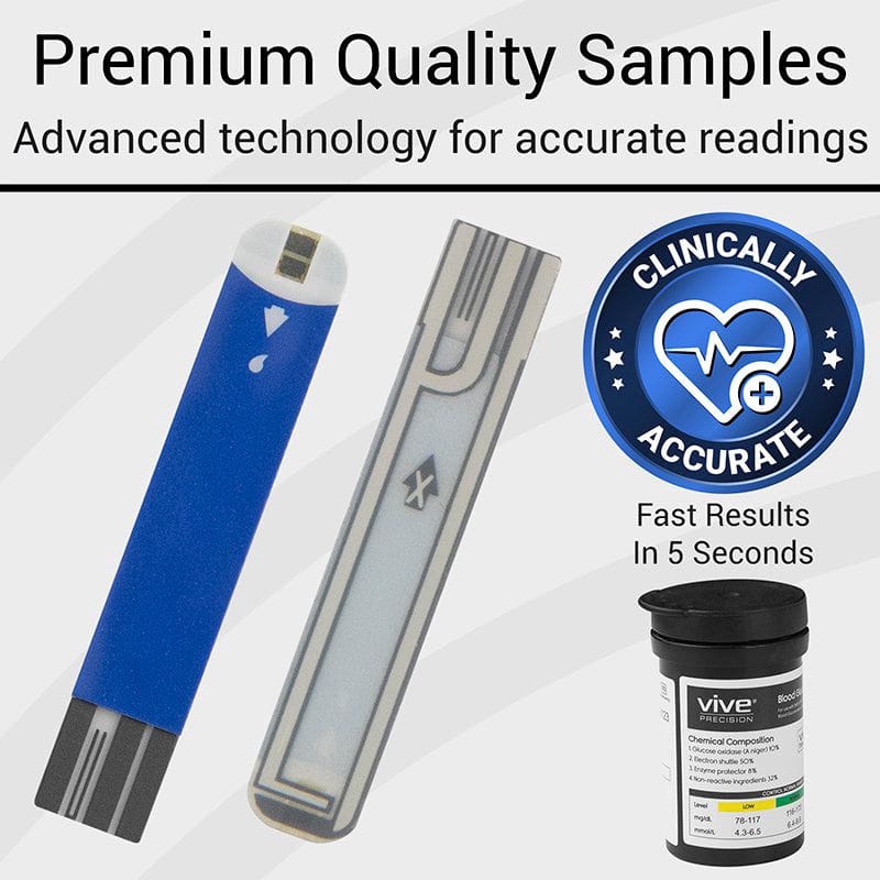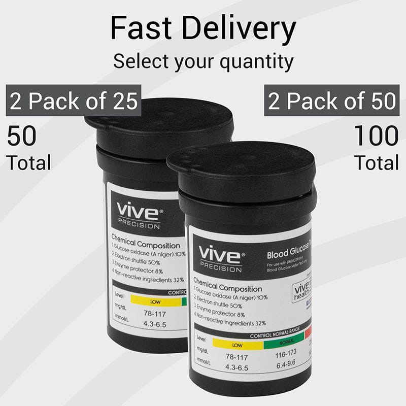 - 50x Blood Glucose Test Strips (2pk of 25) or 100x Blood Glucose Test Strips (2pk of 50)