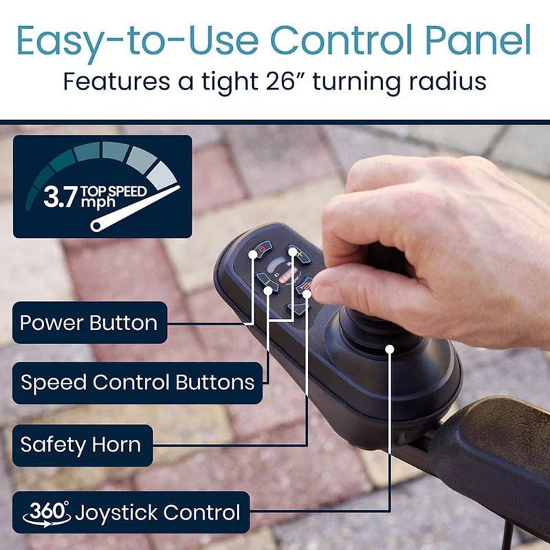Navigate tight spaces with ease using the ergonomic joystick, designed for smooth and responsive control. The power wheelchair’s 26” turning radius allows for seamless movement through narrow areas, while the automatic braking system enhances safety, providing controlled stops for a reliable and comfortable ride.