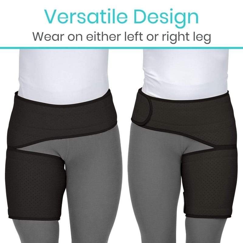 The brace provides pain-relieving support for conditions such as a pulled groin, quad or hamstring, a hip flexor injury, hip bursitis, labral tear, sciatic nerve pain, SI joint pain and other injuries.