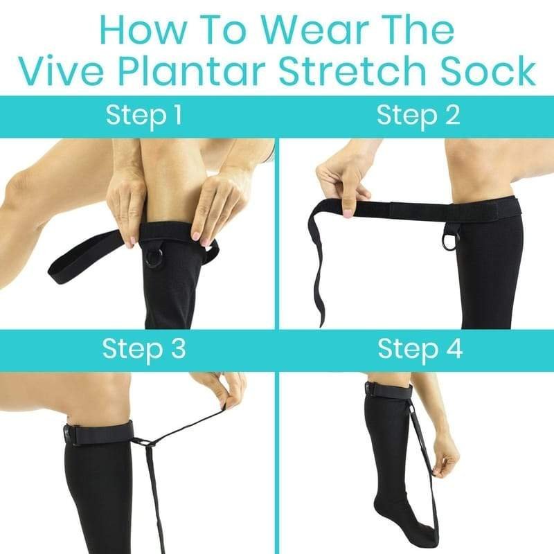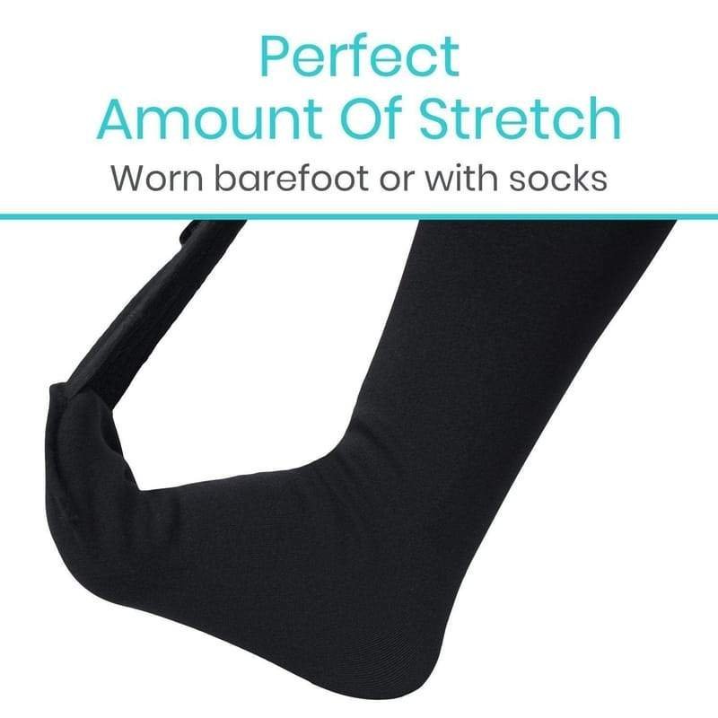 The stretch sock applies adjustable tension to gently stretch the tendons and ligaments in the calf, heel and foot to relieve pain associated with plantar fasciitis.